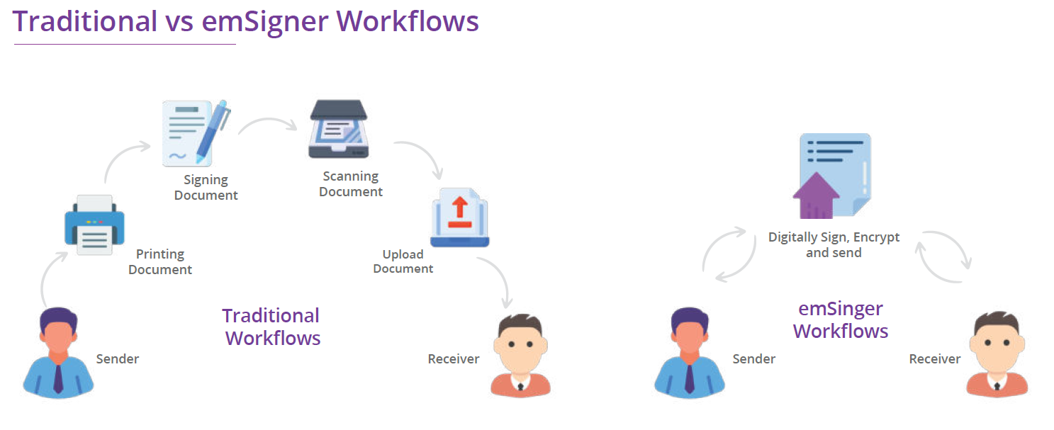 Gestión electrónica de documentos de principio a fin, sin intervención manual, facilitada por las capacidades de firma digital y de flujos de trabajo de emSigner.
